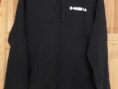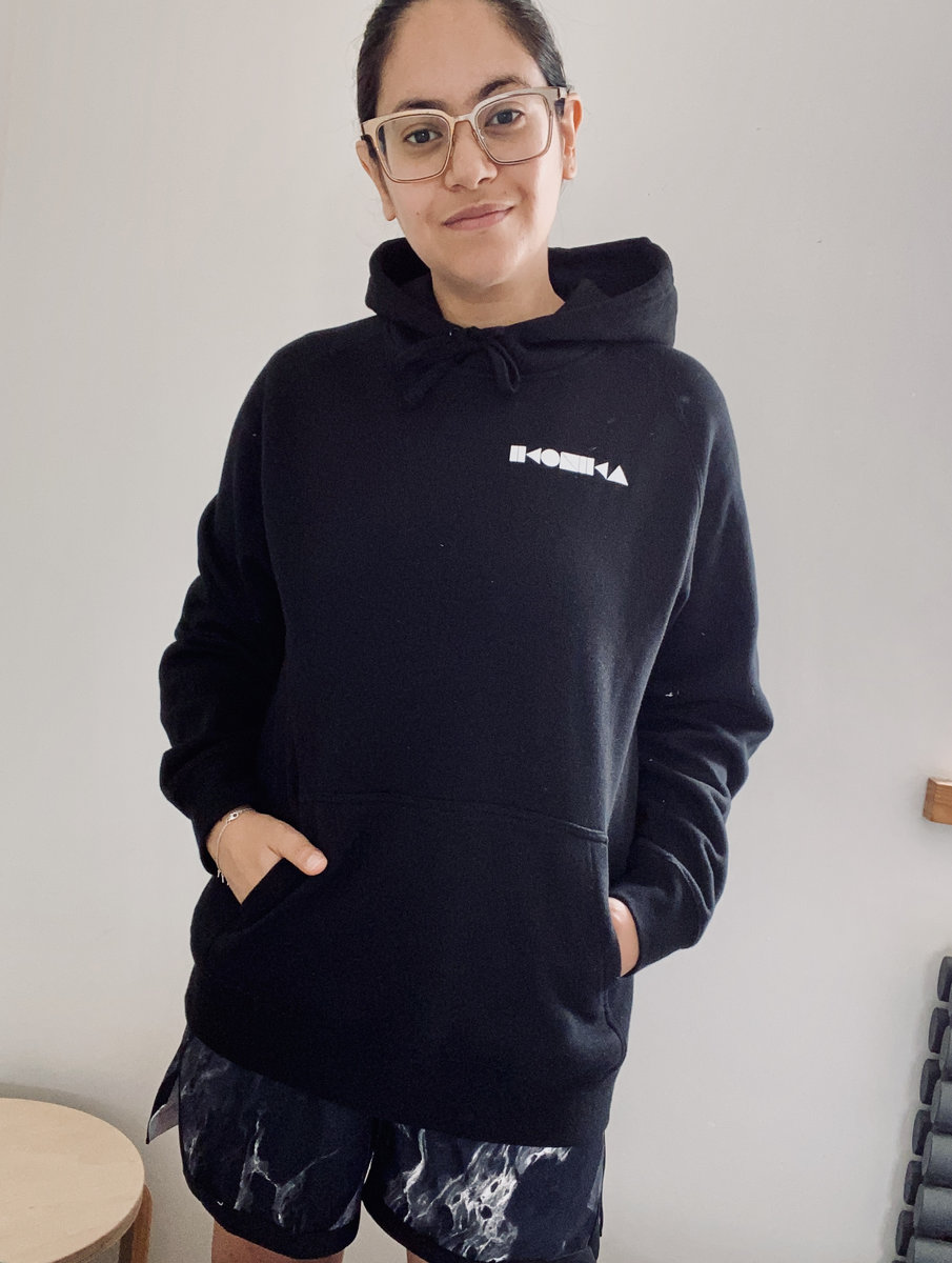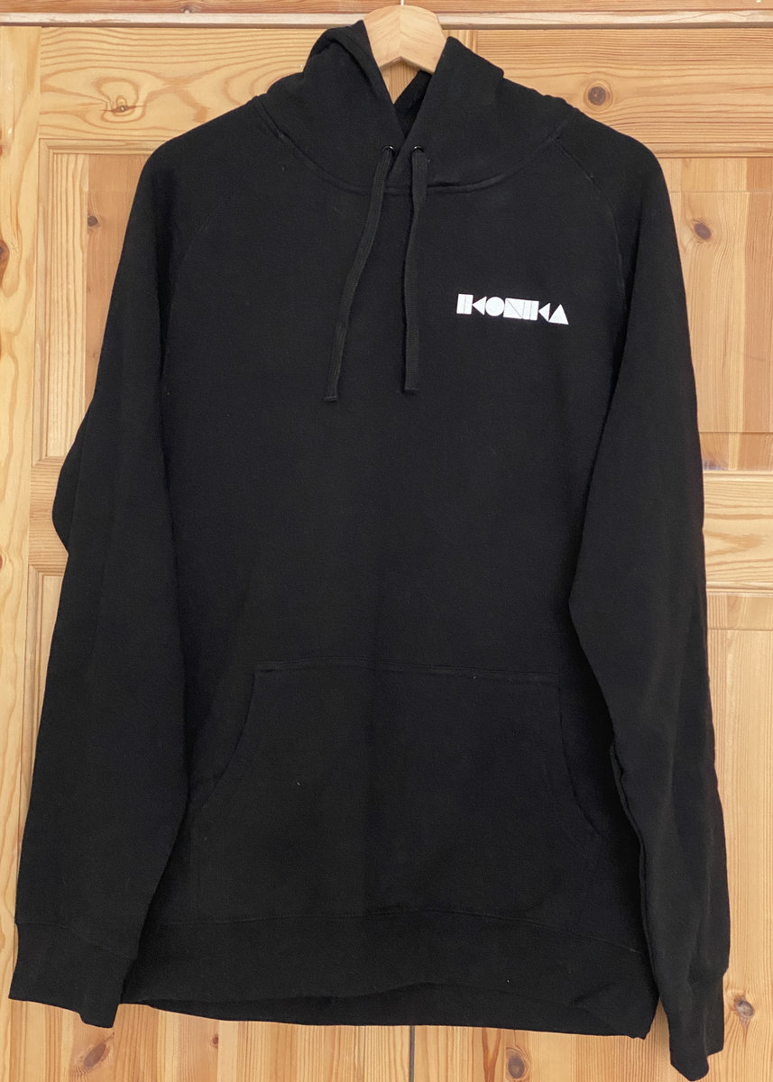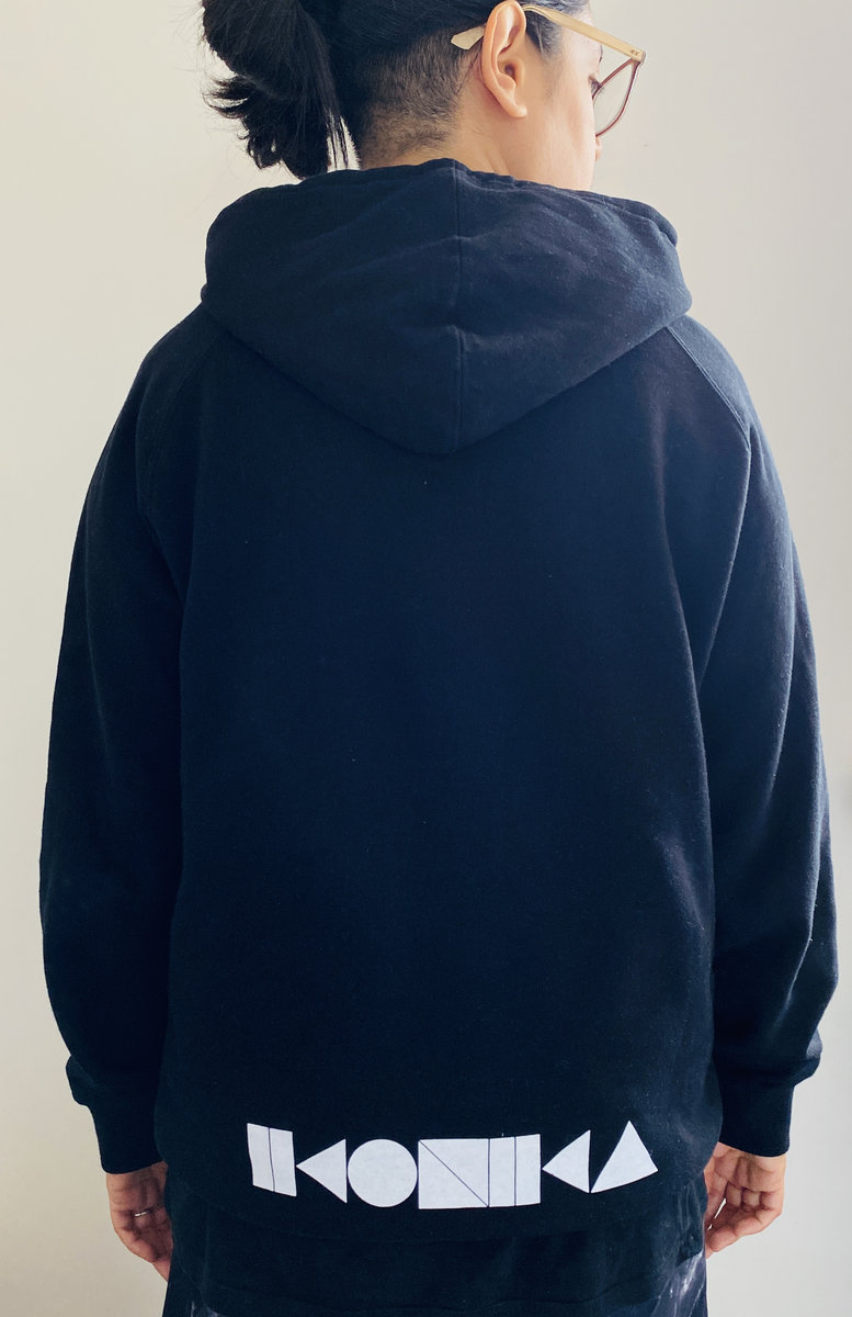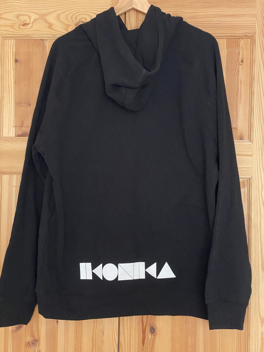 Black hoodie with white Ikonika logo front and back print.